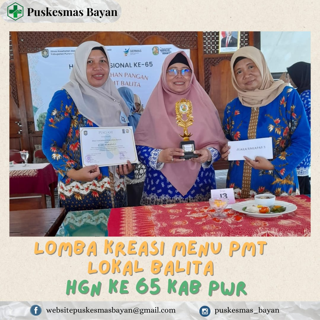 Dalam rangka HGN Ke 65 Kabupaten Purworejo. Puskesmas Bayan berpartisipasi mengikuti Lomba Kreasi Menu PMT Lokal Balita. Kader desa yang ditunjuk dalam mengikuti lomba Kader Desa Tangkisan dan mendapatkan Harapan 3 dalam Lomba Kreasi. Selamaaattt
