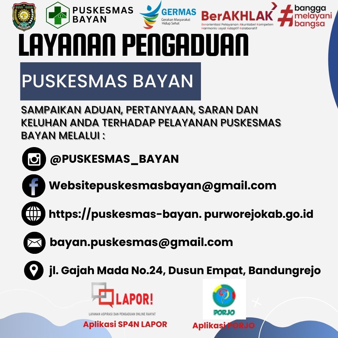 Layanan Aduan Puskesmas Bayan dapat ditujukan melalui berbagai media diantaranya Instagram, facebook, website, Email, SP4N Lapor maupun Aplikasi PORJO