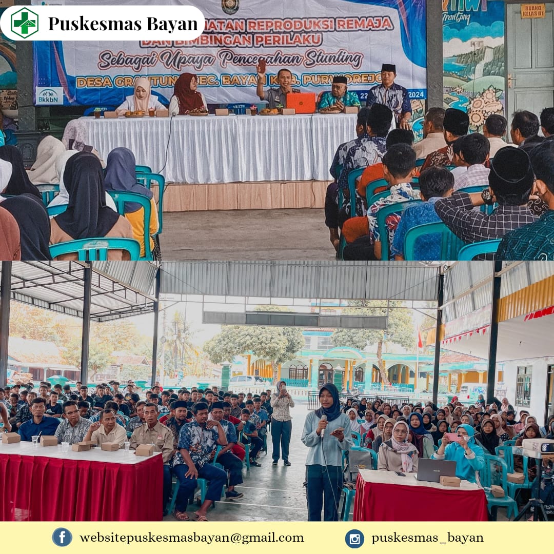 Minggu, 22 September 2024 diadakan Penyuluhan Kesehatan Reproduksi dan Bimbingan Perilaku pada Remaja yang dihadiri oleh Puskesmas Bayan, RSU Ananda Purworejo, Korlap BP KKBPK Kec Bayan, dan Kepala LPKA kelas 1. Peserta dihadiri 300 lebih remaja Desa Grantung. Terimakasih untuk Pemdes Desa Grantung yang sudah mengadakan kegiatan ini. Terimakasih untuk seluruh Remaja Desa Grantung yang sudah ikut berpartisipasi dalam kegiatan ini dan Narasumber yang sudah memberikan Penyuluhan kepada Remaja di Desa Grantung ????????